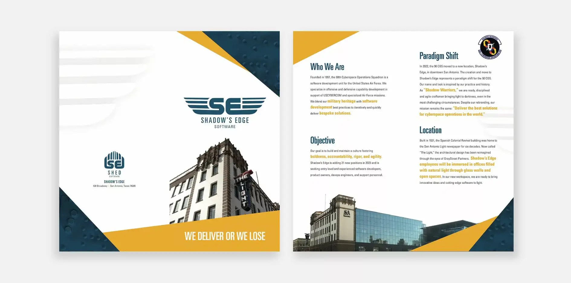 When the Squadron announced a new tenancy at the historic San Antonio Light building in the Fall of 2022, Noisy Trumpet was tasked with developing company branding, positioning, creative design assets, media materials and outreach, talking points, and messaging for a variety of marketing materials. The purpose of this campaign was to drive awareness for Shadow’s Edge: 90th Cyberspace Operations Squadron.