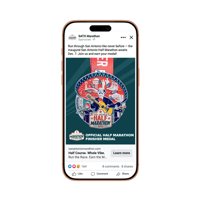 San Antonio Sports partnered with Noisy Trumpet to launch the first-ever San Antonio Marathon. As a brand-new race, the challenge was to build credibility and large-scale awareness while efficiently converting registrations for the 5K, Half Marathon, and Marathon – without wasting budget once races filled.