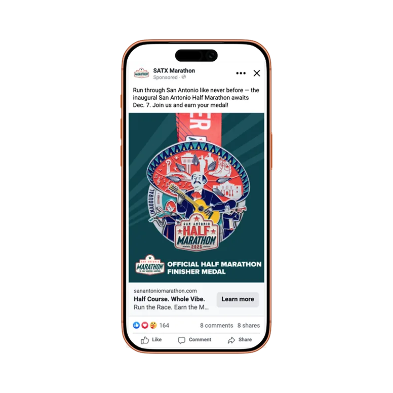 San Antonio Sports partnered with Noisy Trumpet to launch the first-ever San Antonio Marathon. As a brand-new race, the challenge was to build credibility and large-scale awareness while efficiently converting registrations for the 5K, Half Marathon, and Marathon – without wasting budget once races filled.